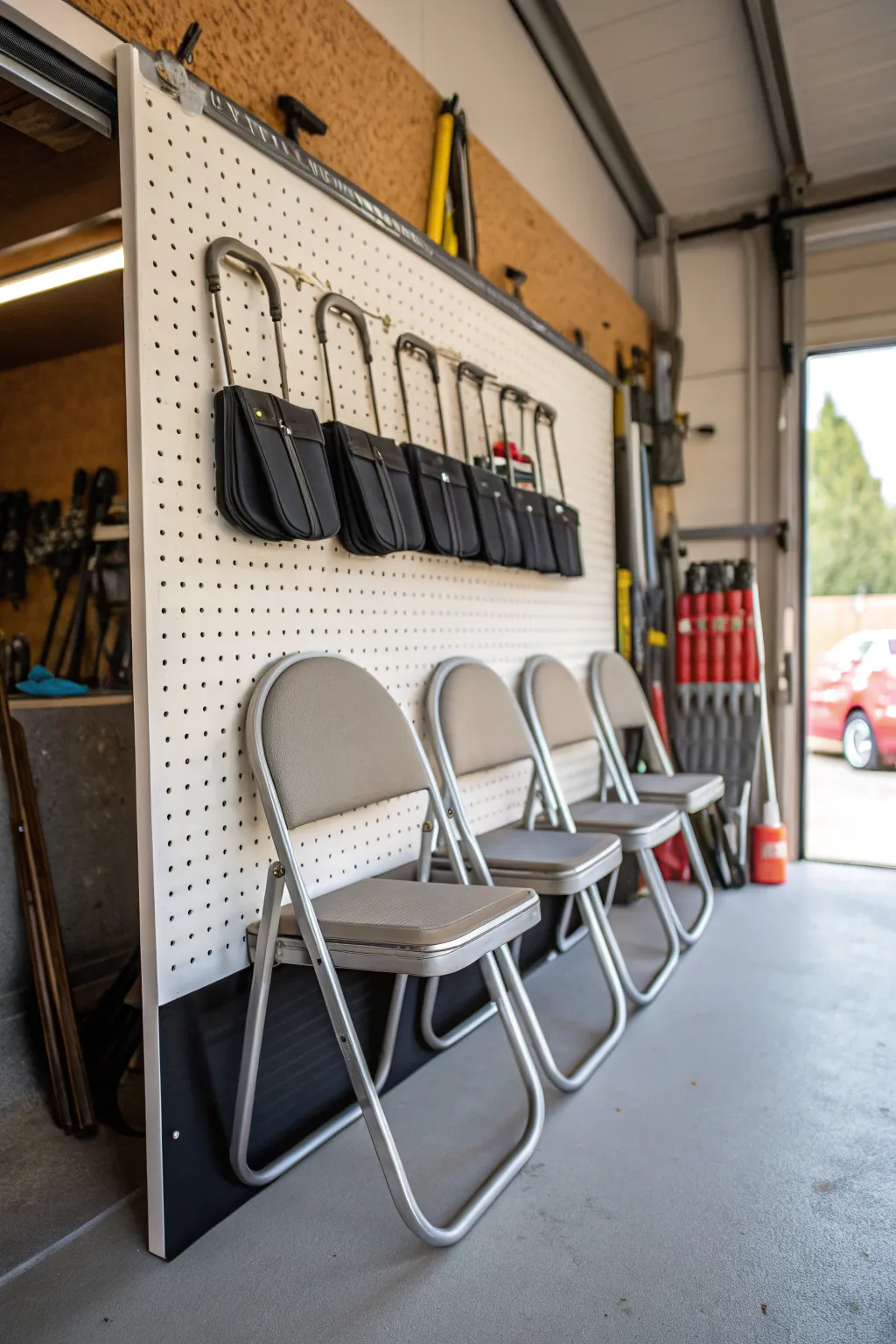 A pegboard in your garage or utility room can be customized to hang folding chairs, making it a versatile and organized solution.