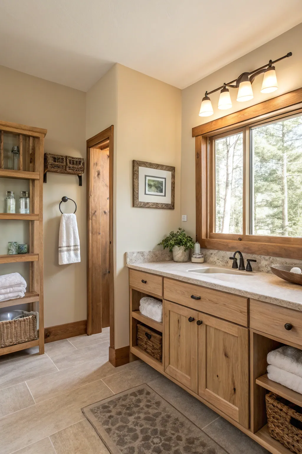 For storage, use open shelves that blend utility and display. It’s a terrific way to have necessities close at hand while displaying lovely towels or decorations.